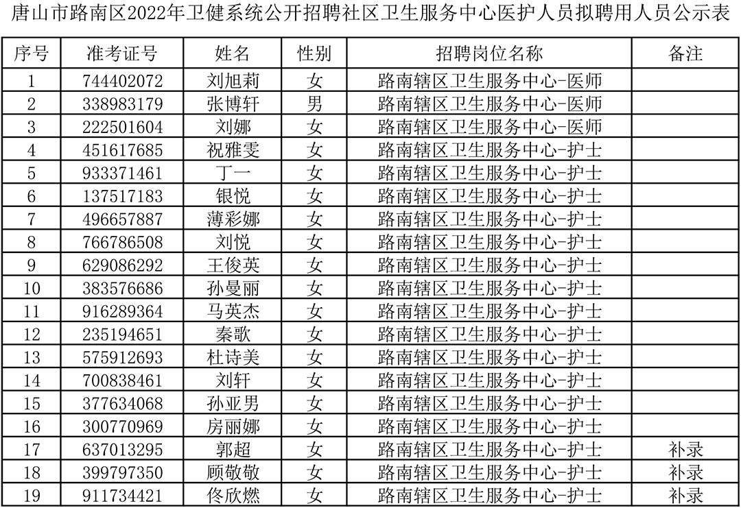 附:《唐山市路南區2022年衛健系統公開招聘社區衛生服務中心醫護人員擬聘用人員公示表》