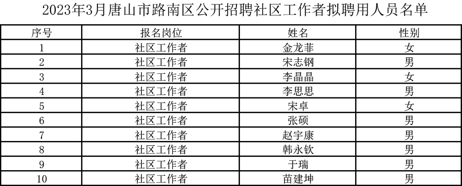 附:《?2023年3月唐山市路南區(qū)公開招聘社區(qū)工作者擬聘用人員名單》