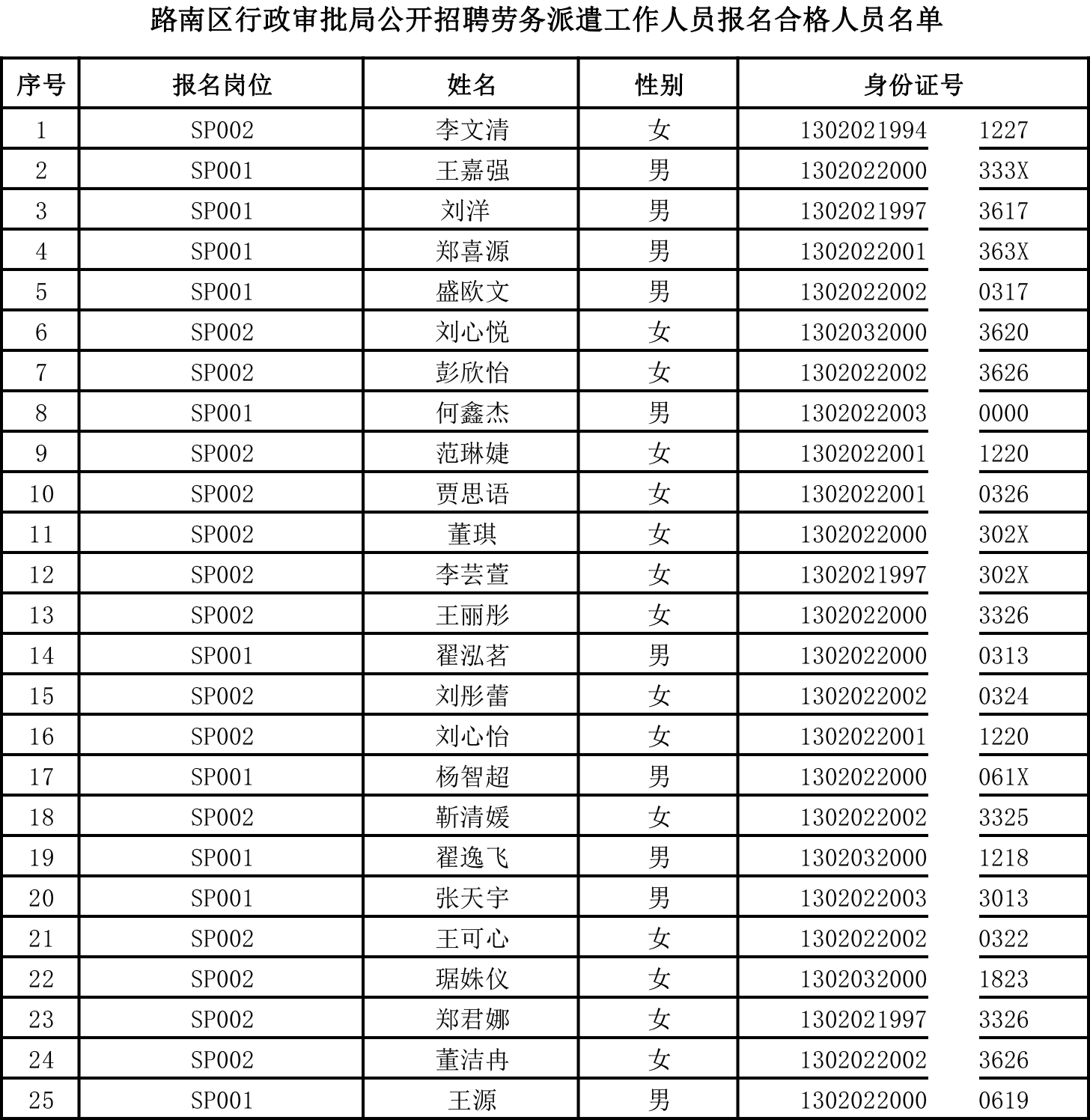 以下為路南區行政審批局勞務派遣工作崗位報名合格人員名單,根據本次招聘報名人數確定,本次考試采用面試考核的方式進行,請考生按照要求參加資格復審及做好面試準備工作: