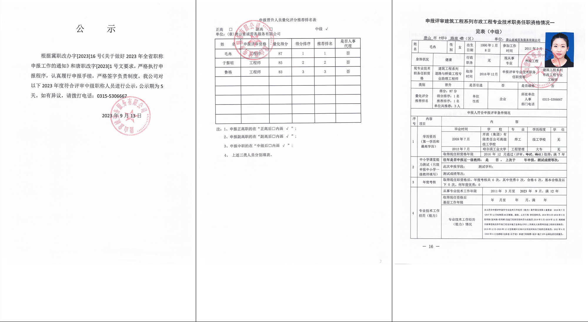 ????? 根據冀職改辦字[2023116 號《關于做好2023 年全省職稱申報工作的通知》和唐職改字[2023]1 號文要求,嚴格執行申報程序,認真履行申報手續,嚴格簽字負責制度。我公司對以下 2023 年度符合評審中級職稱人員進行公示,公示期為5天。如有異議,請撥打電話:0315-5306667。