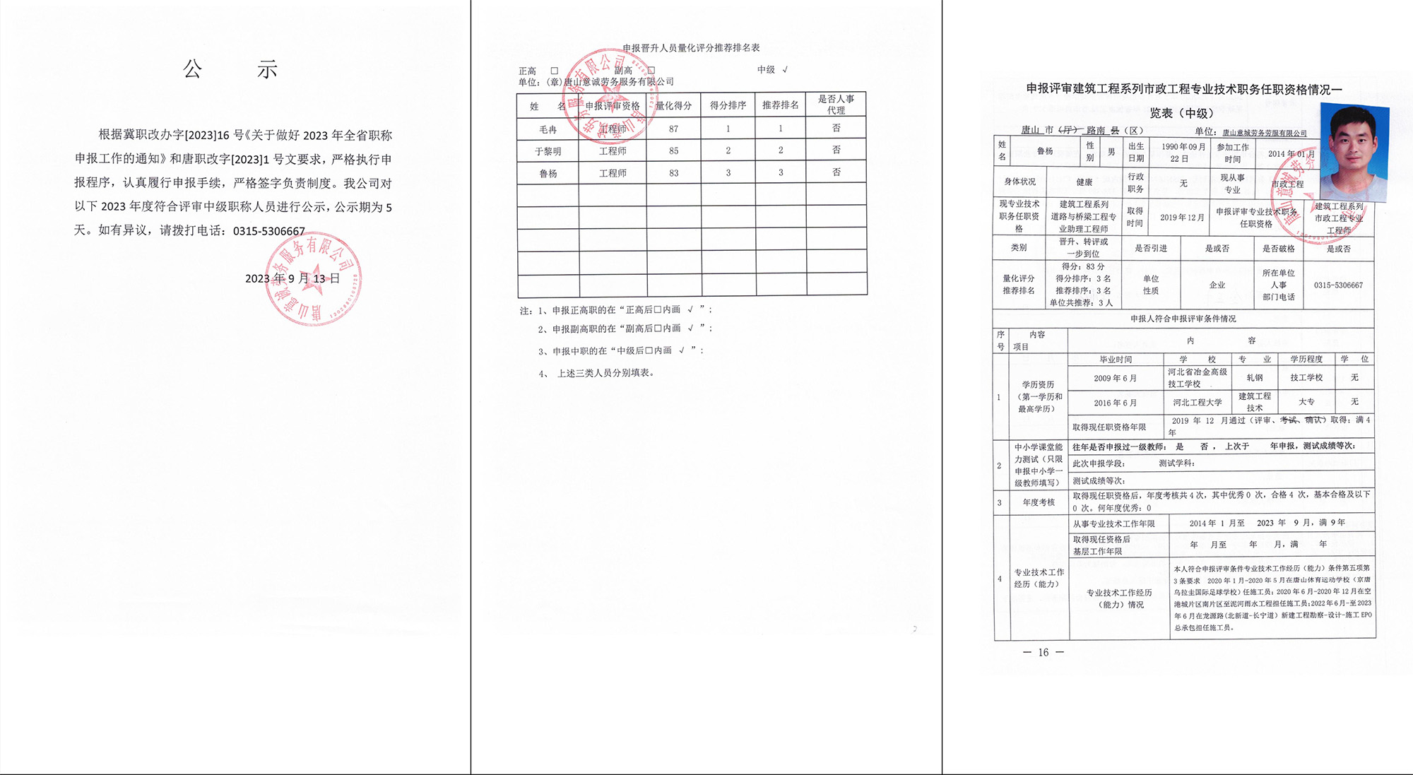 ?????? 根據(jù)冀職改辦字[2023116 號(hào)《關(guān)于做好2023 年全省職稱(chēng)申報(bào)工作的通知》和唐職改字[2023]1 號(hào)文要求,嚴(yán)格執(zhí)行申報(bào)程序,認(rèn)真履行申報(bào)手續(xù),嚴(yán)格簽字負(fù)責(zé)制度。我公司對(duì)以下 2023 年度符合評(píng)審中級(jí)職稱(chēng)人員進(jìn)行公示,公示期為5天。如有異議,請(qǐng)撥打電話:0315-5306667。