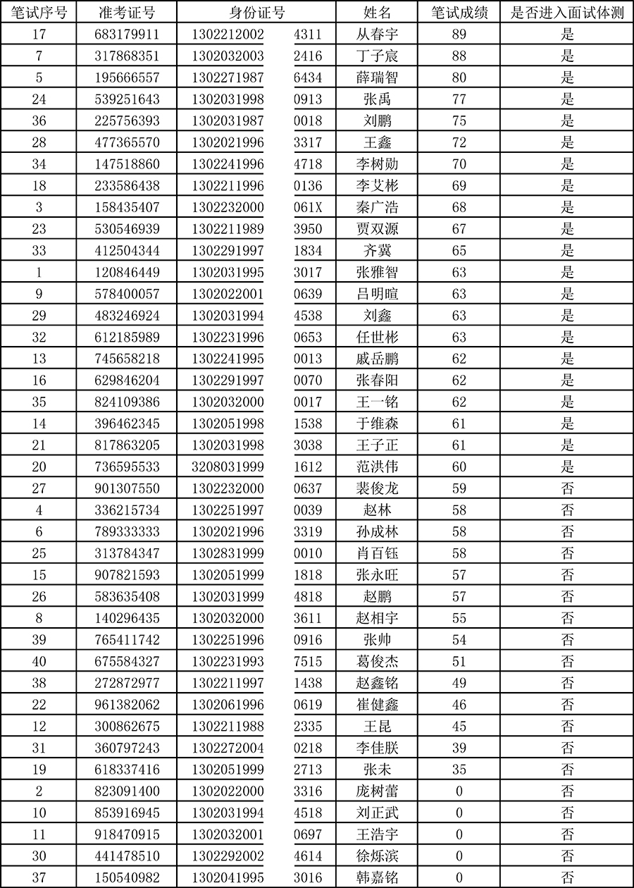 以下為警務(wù)輔助人員筆試成績匯總表
