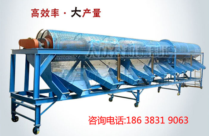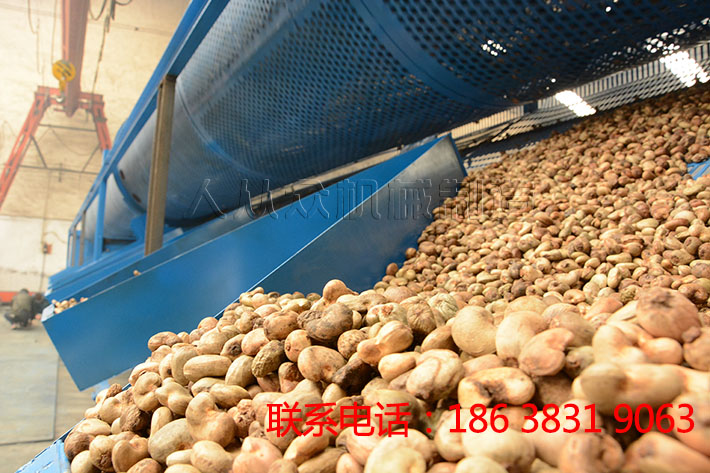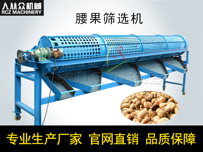 腰果篩分機/干果篩分機替代人工進行大小的分揀,目前我司生產(chǎn)的腰果滾筒篩長度可達12米,篩分量大、效果佳。