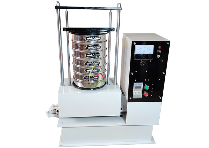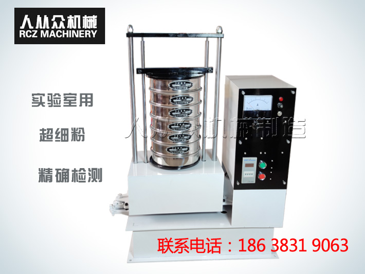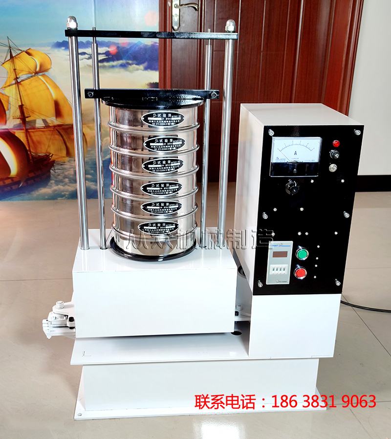 磁懸浮式振動篩通電后電磁裝置形成磁場,起振裝置懸浮在磁場中間,形成了上下高頻振動,再通過底部托盤傳導(dǎo)到安放在托盤上的一套從粗到細(xì)排列的篩具上,使得實驗篩、分樣篩中的物料上下、左右往返振動及運動,使每層實驗篩、分樣篩內(nèi)只留下相同粒度的物料,達(dá)到了不同粒度的分離。