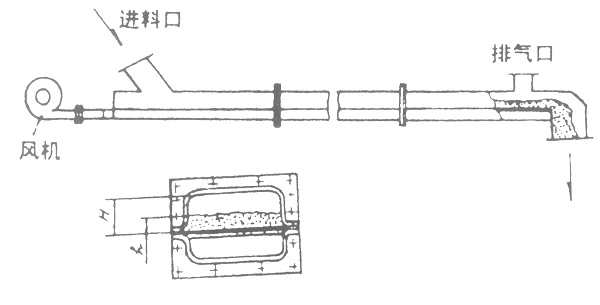 輸送物料由高端喂入上殼體,壓縮空氣由聲調(diào)的鼓風機吹入下殼體并通過密布孔隙的透氣層頒在物料顆粒之間將物料進行所謂的氧化以改變物料的摩擦角使其形成流動狀態(tài)而沿斜度下滑達到輸送的目的。