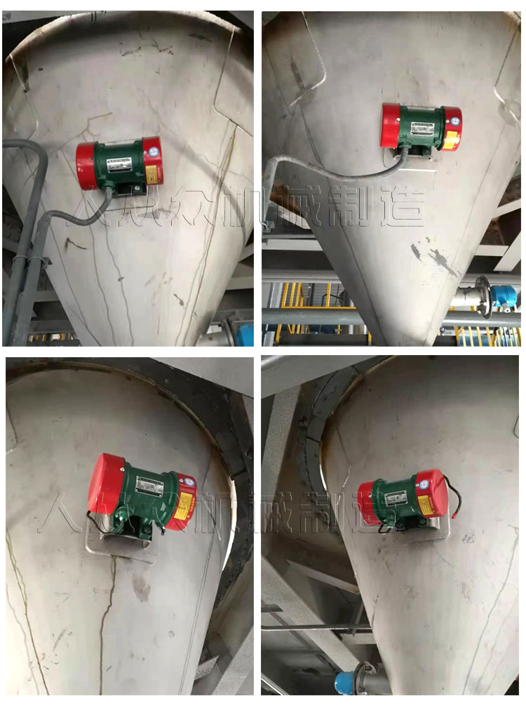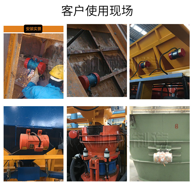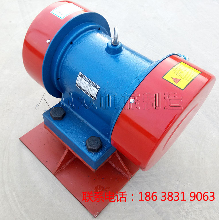 由振動(dòng)電機(jī)、底座兩部分組成。振動(dòng)電機(jī)和底座由螺栓緊密地固定為一體,由于底座堅(jiān)固地安裝在料倉(cāng)壁上,這樣就構(gòu)成了單質(zhì)點(diǎn)定向振動(dòng)系統(tǒng)。當(dāng)防閉塞裝置工作時(shí),振動(dòng)電機(jī)的高速轉(zhuǎn)動(dòng),便產(chǎn)生了對(duì)料倉(cāng)壁的周期性高頻振動(dòng),由于防閉塞裝置的周期性振動(dòng),一方面使物料與倉(cāng)壁脫離接觸、消除物料與倉(cāng)壁的摩擦,另一方面使物料受交變速度和加速度的影響,處于不穩(wěn)定狀態(tài),從而有效地克服物料的內(nèi)摩擦力和聚集力,以消除料倉(cāng)內(nèi)物料間的相對(duì)穩(wěn)定性,使物料從料倉(cāng)口順利排出。